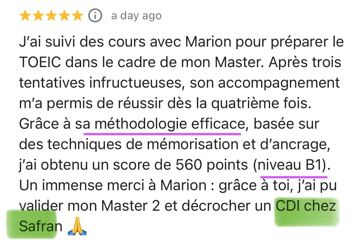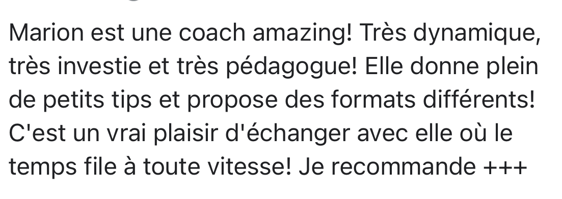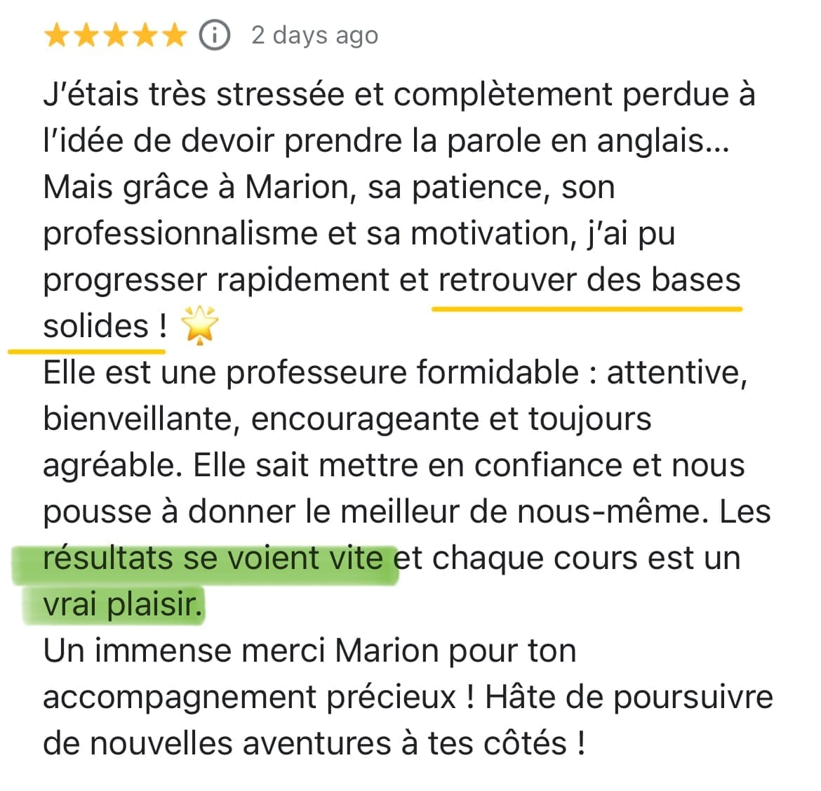 Chaque séance est un vrai moment de plaisir et de progrès. Elle sait créer un climat de confiance qui donne envie de parler, de se tromper, d’apprendre. Grâce à elle, j’ai enfin trouvé le plaisir de l’anglais et je me surprends à oser beaucoup plus à l’oral.